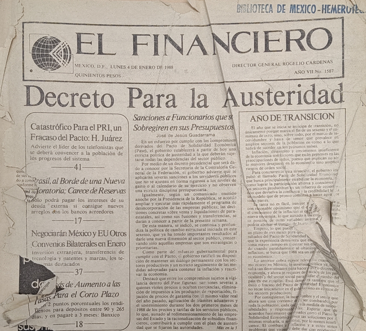 El Financiero Compartir Documento MX-SC-DGB-BP-MC-HR0382 Descargar Monsiteca hemerográficaTÃtulo de la revistaEl FinancieroAño de inicio1981EditorialEl Financiero S.A. de C.V.PeriodicidaddiariaArtÃculos El Santo en favor de las cosmogonÃas Fecha de publicación 13 Octubre 1988