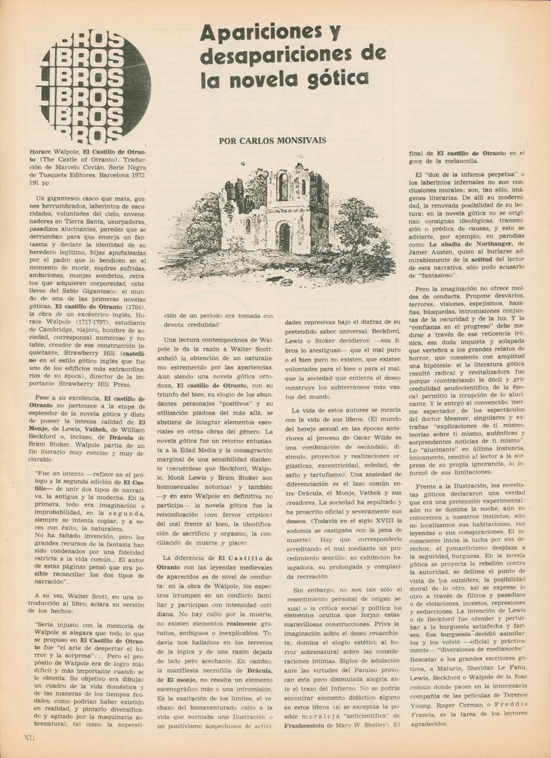 Apariciones y desapariciones de la novela gótica Compartir Documento MX-SC-DGB-BP-MC-HA1119-A Descargar Adjuntos MX-SC-DGB-BP-MC-HA1119-C Monsiteca artículosTítulo del artículoApariciones y desapariciones de la novela góticaNombre de la revista La Cultura en México Año de inicio 1962 Editorial Revista Siempre Periodicidad semanal Fecha de publicación25 Abril 1973Nombre del autor o autora Carlos Monsiváis Página de inicioXIINúmero de revista585Contenido temático ColecciónHemerográfico
