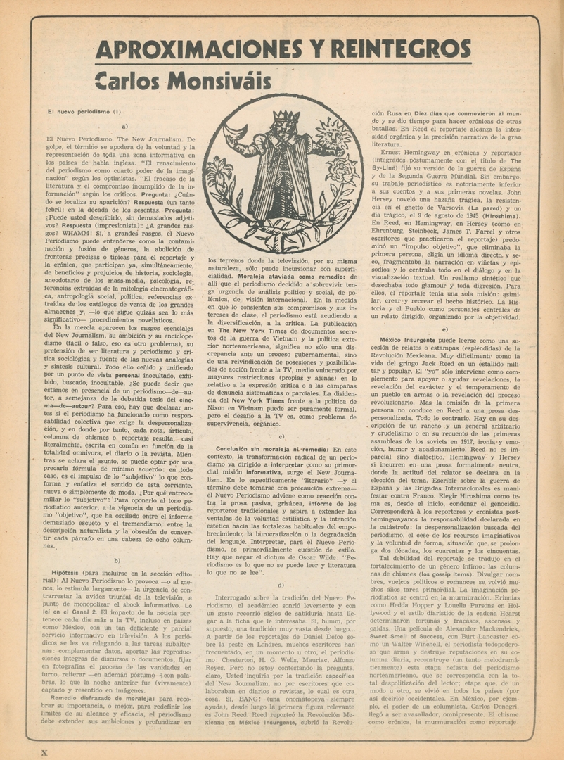 Aproximaciones y reintegros: El nuevo periodismo (I) Compartir Documento MX-SC-DGB-BP-MC-HA1087-A Descargar Adjuntos MX-SC-DGB-BP-MC-HA1087-C Monsiteca artículosTítulo del artículoAproximaciones y reintegros: El nuevo periodismo (I)Nombre de la revista La Cultura en México Año de inicio 1962 Editorial Revista Siempre Periodicidad semanal Fecha de publicación5 Abril 1972Nombre del autor o autora Carlos Monsiváis Página de inicioXNúmero de revista530Contenido temático ColecciónHemerográfico