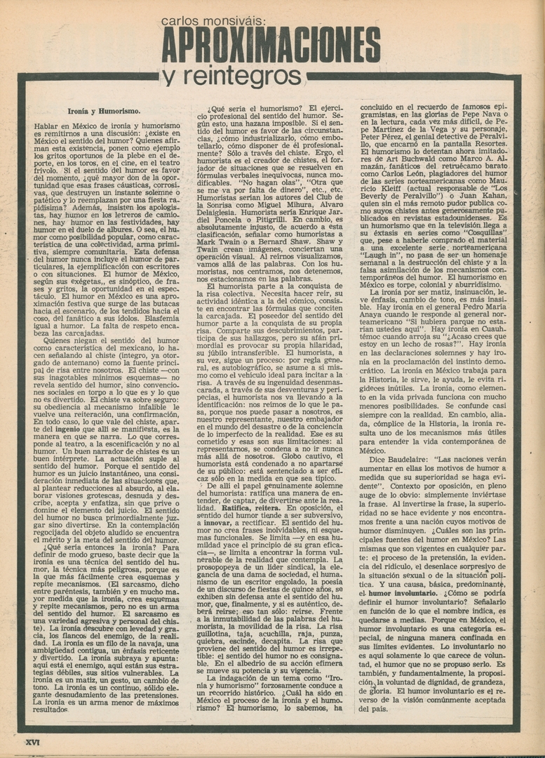 Aproximaciones y reintegros: Ironía y humorismo Compartir Documento MX-SC-DGB-BP-MC-HA1076-A Descargar Adjuntos MX-SC-DGB-BP-MC-HA1076-C Monsiteca artículosTítulo del artículoAproximaciones y reintegros: Ironía y humorismoNombre de la revista La Cultura en México Año de inicio 1962 Editorial Revista Siempre Periodicidad semanal Fecha de publicación26 Agosto 1970Nombre del autor o autora Carlos Monsiváis Página de inicioXVINúmero de revista446Contenido temático ColecciónHemerográfico