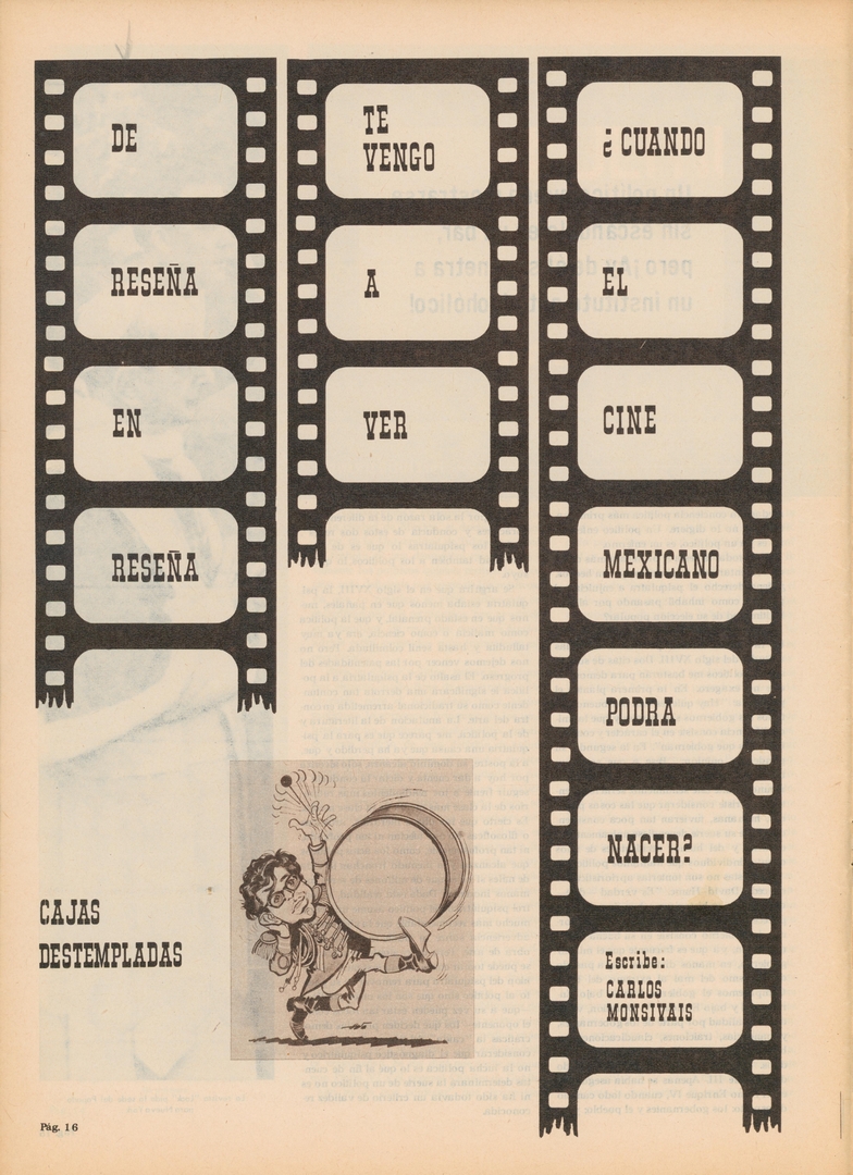 Cajas destempladas: De reseña en reseña te vengo a ver Compartir Documento MX-SC-DGB-BP-MC-HA0582-A Descargar Adjuntos MX-SC-DGB-BP-MC-HA0582-C Monsiteca artículosTítulo del artículoCajas destempladas: De reseña en reseña te vengo a verNombre de la revista Ponch de México Año de inicio 1968 Editorial S/E Periodicidad irregular Fecha de publicación1968Nombre del autor o autora Carlos Monsiváis Página de inicio16Número de revista8Contenido temáticoDe Reseña en reseña te vengo a ver ¿Cuándo el cine mexicano podrá nacer?ColecciónHemerográfico