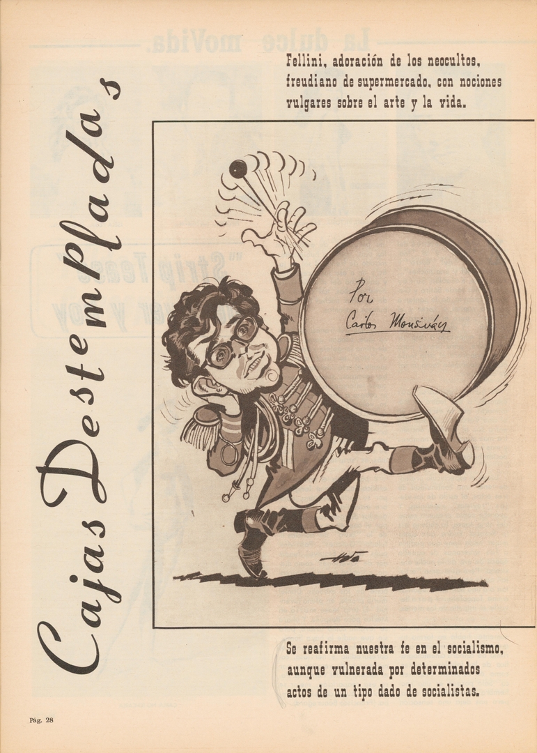 Cajas destempladas: Fellini, adoración de los neocultos, freudiano de supermercado, con nociones vulgares sobre el arte y la vida Compartir Documento MX-SC-DGB-BP-MC-HA0576-A Descargar Adjuntos MX-SC-DGB-BP-MC-HA0576-C Monsiteca artículosTítulo del artículoCajas destempladas: Fellini, adoración de los neocultos, freudiano de supermercado, con nociones vulgares sobre el arte y la vidaNombre de la revista Ponch de México Año de inicio 1968 Editorial S/E Periodicidad irregular Fecha de publicación29 Agosto 1968Nombre del autor o autora Carlos Monsiváis Página de inicio28Número de revista2Contenido temático“Se reafirma nuestra fe en el socialismo, aunque vulnerada por determinados actos de un tipo dado de socialistas”ColecciónHemerográfico