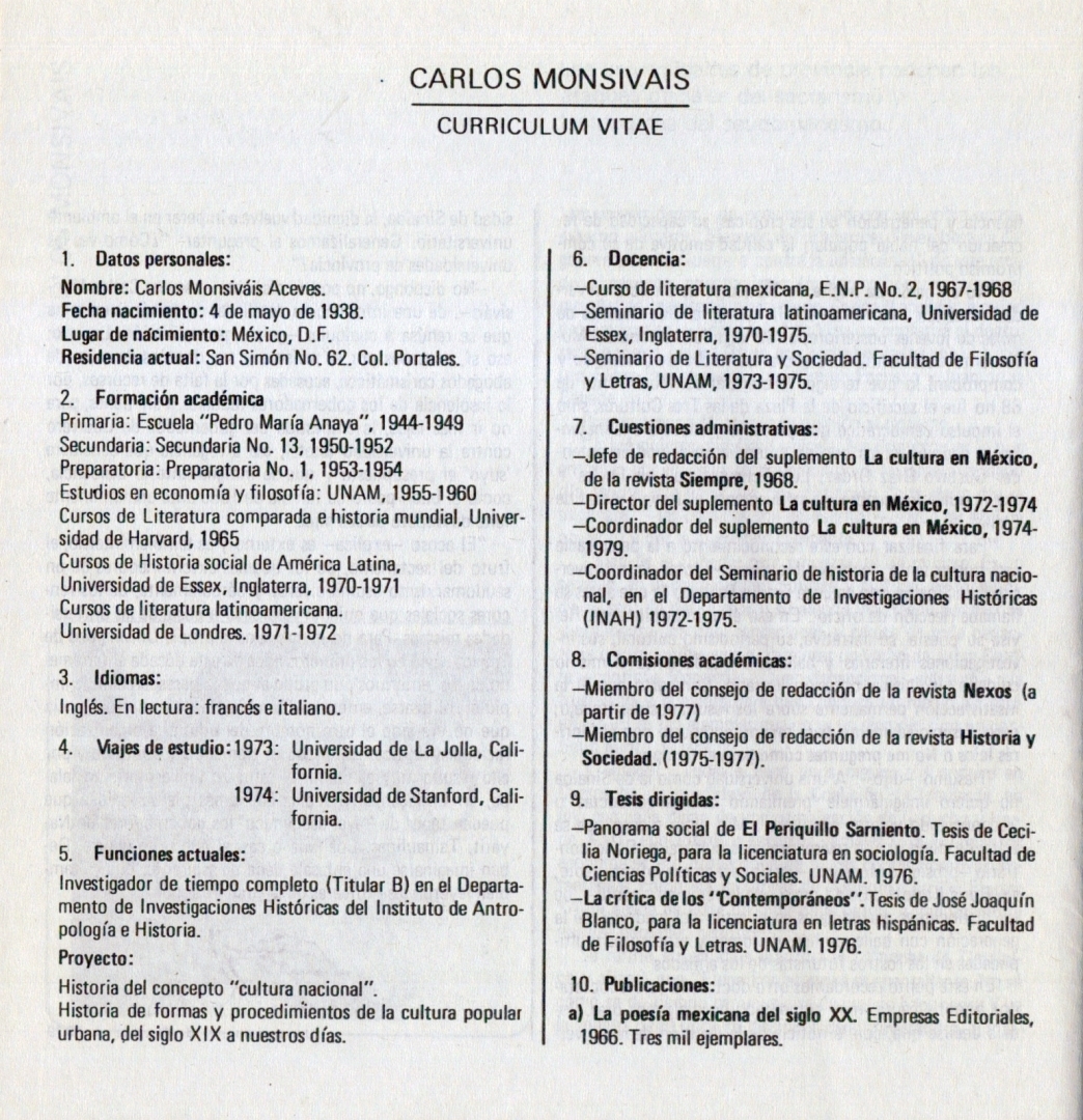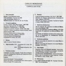 Carlos Monsivais: Curriculum vitae Compartir Documento MX-SC-DGB-BP-MC-HA0910-A Descargar Adjuntos MX-SC-DGB-BP-MC-HA0910-C Monsiteca artículosTítulo del artículoCarlos Monsivais: Curriculum vitaeNombre de la revista Buelna Año de inicio 1979 Editorial Universidad Autónoma de Sinaloa Periodicidad bimestral Fecha de publicaciónOctubre - Noviembre 1979Nombre del autor o autora Carlos Monsiváis Página de inicioS/NNúmero de revistaS/NContenido temáticoLa Universidad Autónoma de Sinaloa rinde un homenaje a Juan de la Cabada y otorga el grado de "Doctor Honoris Causa" a los siguientes escritores: Maestro Juan de la Cabada, Elena Poniatowska, Carlos Monsiváis y José Emilio PachecoColecciónHemerográfico