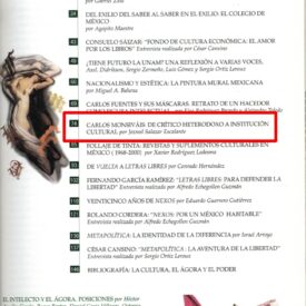 Carlos Monsiváis, “un género en si mismo” -Paz dixit-, es hoy una institución cultural viviente. Su vida y obra están marcadas por la heterodoxia contrahegemónica, la excentricidad erudita, caótica e irónica, y la abierta critica al autoritarismo”
