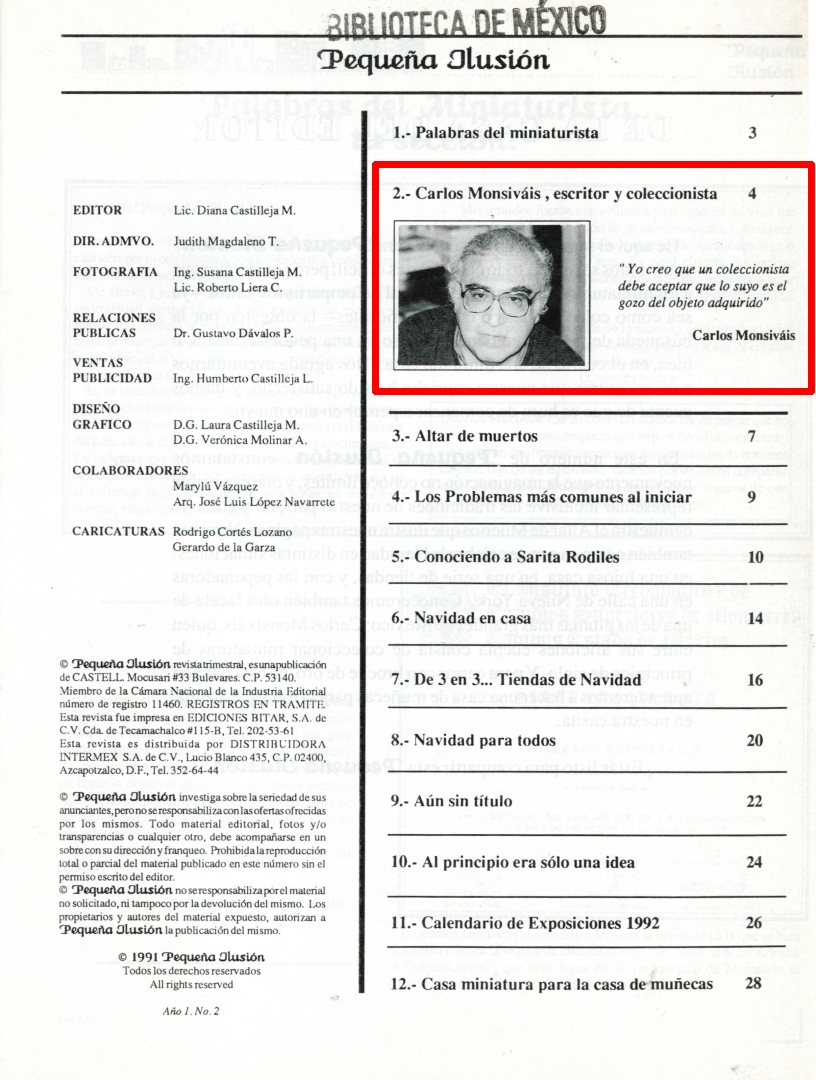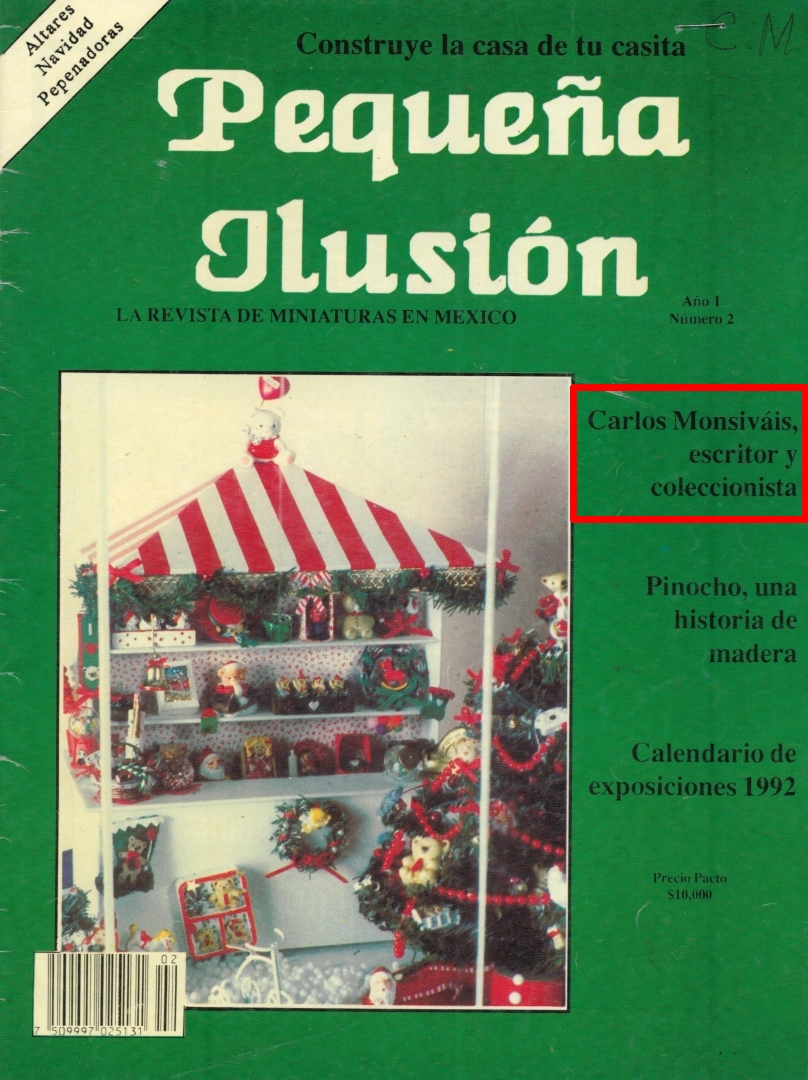 Carlos Monsiváis, escritor y coleccionista. Compartir Documento MX-SC-DGB-BP-MC-HA0561-A Descargar Adjuntos MX-SC-DGB-BP-MC-HA0561-A-1 MX-SC-DGB-BP-MC-HA0561-B Monsiteca artículosTítulo del artículoCarlos Monsiváis, escritor y coleccionista.Nombre de la revista Pequeña ilusión Año de inicio 1991 Editorial CASTELL Periodicidad trimestral Fecha de publicación1991Nombre del autor o autora Diana Castilleja Página de inicio4Número de revista2Contenido temático“Yo creo que un coleccionista debe aceptar que lo suyo es el gozo del objeto adquirido” “Dentro de mi colección hay piezas con gran valor artístico, que revelan el gran talento, -en momentos- el arte incomparable de los miniaturistas”ColecciónHemerográfico