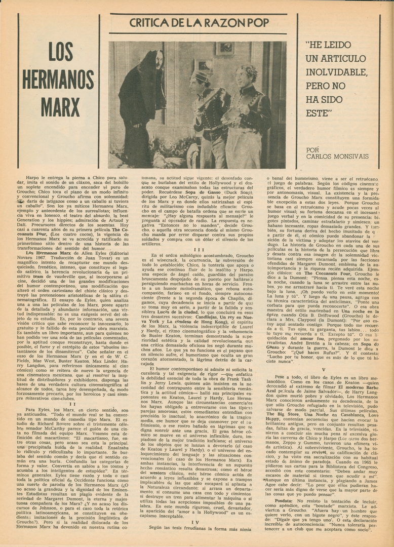 Critica de la razón pop: Los hermanos Marx Compartir Documento MX-SC-DGB-BP-MC-HA1016-A Descargar Adjuntos MX-SC-DGB-BP-MC-HA1016-C Monsiteca artículosTítulo del artículoCritica de la razón pop: Los hermanos MarxNombre de la revista La Cultura en México Año de inicio 1962 Editorial Revista Siempre Periodicidad semanal Fecha de publicación11 Octubre 1967Nombre del autor o autora Carlos Monsiváis Página de inicioXVINúmero de revista295Contenido temático ColecciónHemerográfico
