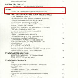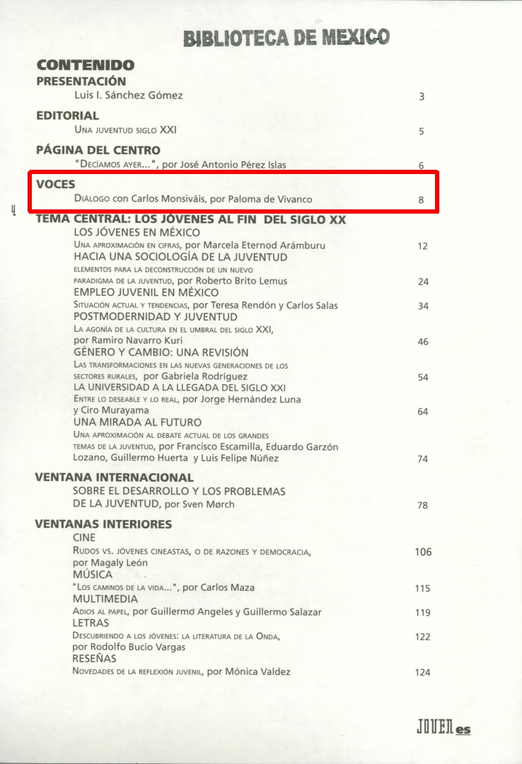 Dialogo con Carlos Monsiváis. Compartir Documento MX-SC-DGB-BP-MC-HA0351-A Descargar Adjuntos MX-SC-DGB-BP-MC-HA0351-A-1 MX-SC-DGB-BP-MC-HA0351-B Monsiteca artículosTítulo del artículoDialogo con Carlos Monsiváis.Nombre de la revista Joven es Año de inicio [1996] Editorial Centro de Investigación y Estudios sobre Juventud Periodicidad trimestral Fecha de publicación1996Nombre del autor o autora Paloma de Vivanco Página de inicio8Número de revista1Contenido temáticoInicia con un comentario Monsiváis y dice para empezar, él no se considera joven, con el énfasis de ahora. Entrevista a Monsiváis en la que quieren conocer su clara visión de la juventud al paso de los añosColecciónHemerográfico