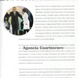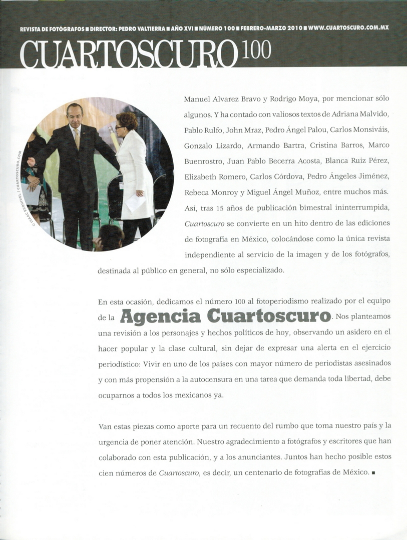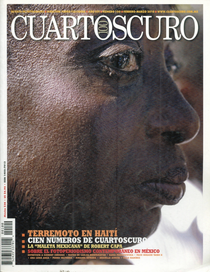 Fotoperiodismo, la vigilia de cuartoscuro Compartir Documento MX-SC-DGB-BP-MC-HA0956-A Descargar Adjuntos MX-SC-DGB-BP-MC-HA0956-B MX-SC-DGB-BP-MC-HA0956-C Monsiteca artículosTítulo del artículoFotoperiodismo, la vigilia de cuartoscuroNombre de la revista Cuartoscuro Año de inicio 1996 Editorial Cuartoscuro Periodicidad trimestral Fecha de publicaciónFebrero - Marzo 2010Nombre del autor o autora Elena Poniatowska Seudónimo(s) la Princesa Roja. Página de inicio34Número de revista100Contenido temático ColecciónHemerográfico