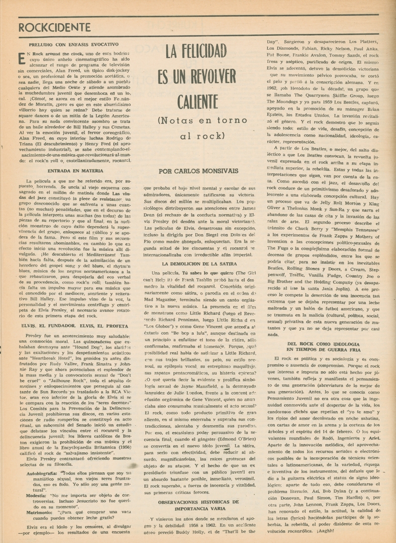 La felicidad es un revolver caliente (notas en torno al rock) Compartir Documento MX-SC-DGB-BP-MC-HA1034-A Descargar Adjuntos MX-SC-DGB-BP-MC-HA1034-C Monsiteca artículosTítulo del artículoLa felicidad es un revolver caliente (notas en torno al rock)Nombre de la revista La Cultura en México Año de inicio 1962 Editorial Revista Siempre Periodicidad semanal Fecha de publicación12 Marzo 1969Nombre del autor o autora Carlos Monsiváis Página de inicioXVINúmero de revista369Contenido temático ColecciónHemerográfico