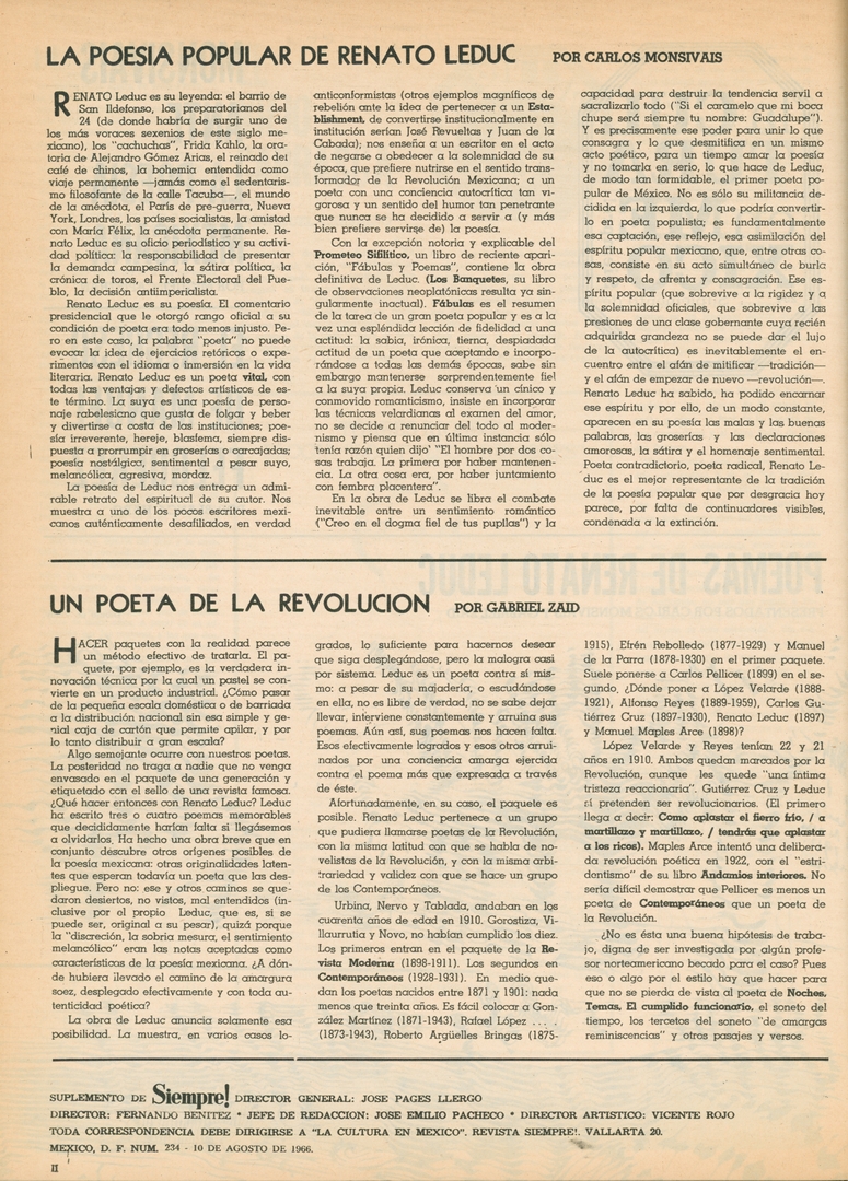 La poesia popular de Renato Leduc Compartir Documento MX-SC-DGB-BP-MC-HA0996-A Descargar Adjuntos MX-SC-DGB-BP-MC-HA0996-C Monsiteca artículosTítulo del artículoLa poesia popular de Renato LeducNombre de la revista La Cultura en México Año de inicio 1962 Editorial Revista Siempre Periodicidad semanal Fecha de publicación10 Agosto 1966Nombre del autor o autora Carlos Monsiváis Página de inicioIINúmero de revista234Contenido temático ColecciónHemerográfico