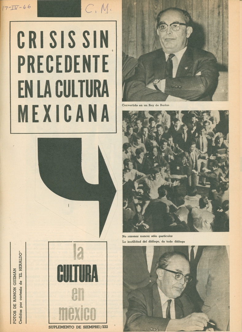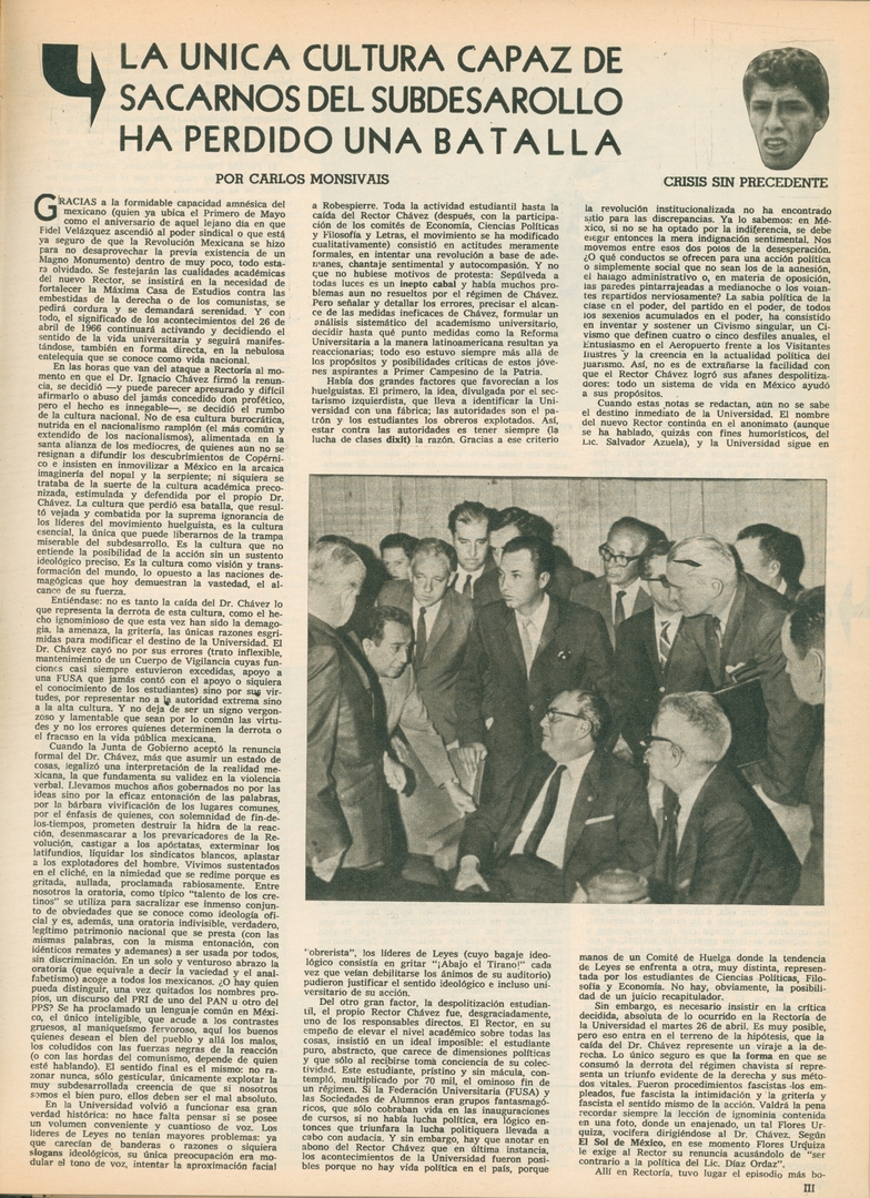 La única cultura capaz de sacarnos del subdesarrollo ha perdido una batalla Compartir Documento MX-SC-DGB-BP-MC-HA0994-A Descargar Adjuntos MX-SC-DGB-BP-MC-HA0994-C Monsiteca artículosTítulo del artículoLa única cultura capaz de sacarnos del subdesarrollo ha perdido una batallaNombre de la revista La Cultura en México Año de inicio 1962 Editorial Revista Siempre Periodicidad semanal Fecha de publicación17 Abril 1966Nombre del autor o autora Carlos Monsiváis Página de inicioIIINúmero de revista222Contenido temático ColecciónHemerográfico