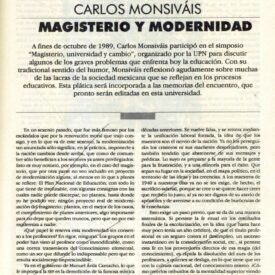 A fines de octubre de 1989,Carlos Monsiváis participó en el simposio "Magisterio,universidad y cambio",organizado por la UPN para discutir algunos de los graves problemas que enfrenta hoy la educación. Con su tradicional sentido del humor.Monsiváis reflexionó agudamente sobre muchas de las lacras de la sociedad mexicana que se reflejan en los procesos educativos. El ataque a la imagen magisterial no se da,por supuesto,a través de argumentps,sino de pruebas contundentes,el bajísimo salario,la reducción administrativa,la falta de incentivos en materia de profesionalización,la idea de que han llegado a donde podían llegar. La respuesta previsible esinmediata:sólo los que no pueden evitarlo,por vocación o por falta de oportunidades,eligen el magisterio como estación terminal. Los jóvenes insisten,sobre todo los más inquietos,en verlo como una estación de paso,algo semejante a la etapa como burocráta en una secretaría de estado. Si alguien quiere leer argumentos insustanciales los remito a los discursos del lic. Torres Bodet,quien era una prueba viva de la falta de comprensión que había hacia el magisterio,ejemplificada con la elección de personajes anacrónicos para secretarios de Educación. Si ustedes ven la hilera de secretarios de Educación de toda esta etapa,verán que se trataba de abogados muy poco cultos,con énfasis burocráticos muy altos,en algunos casos sin siquiera una mínima formación:de seres sin calificación profesional,sin los requisitos mínimos para ser tomados seriamente en cuenta. Al perderse la batalla de la educación como redención popular,algo que ya está muy claro en los años 40,se vuelve a una estructura dictatorial de la educación mexicana. No está contemplado en su estructura que los sindicatos,las etnias,las poblaciones,los propios alumnos,tengan gestión o tengan participación en que quieren y necesitan aprender y cómo quieren redimirse colectivamente a sí mismos.
