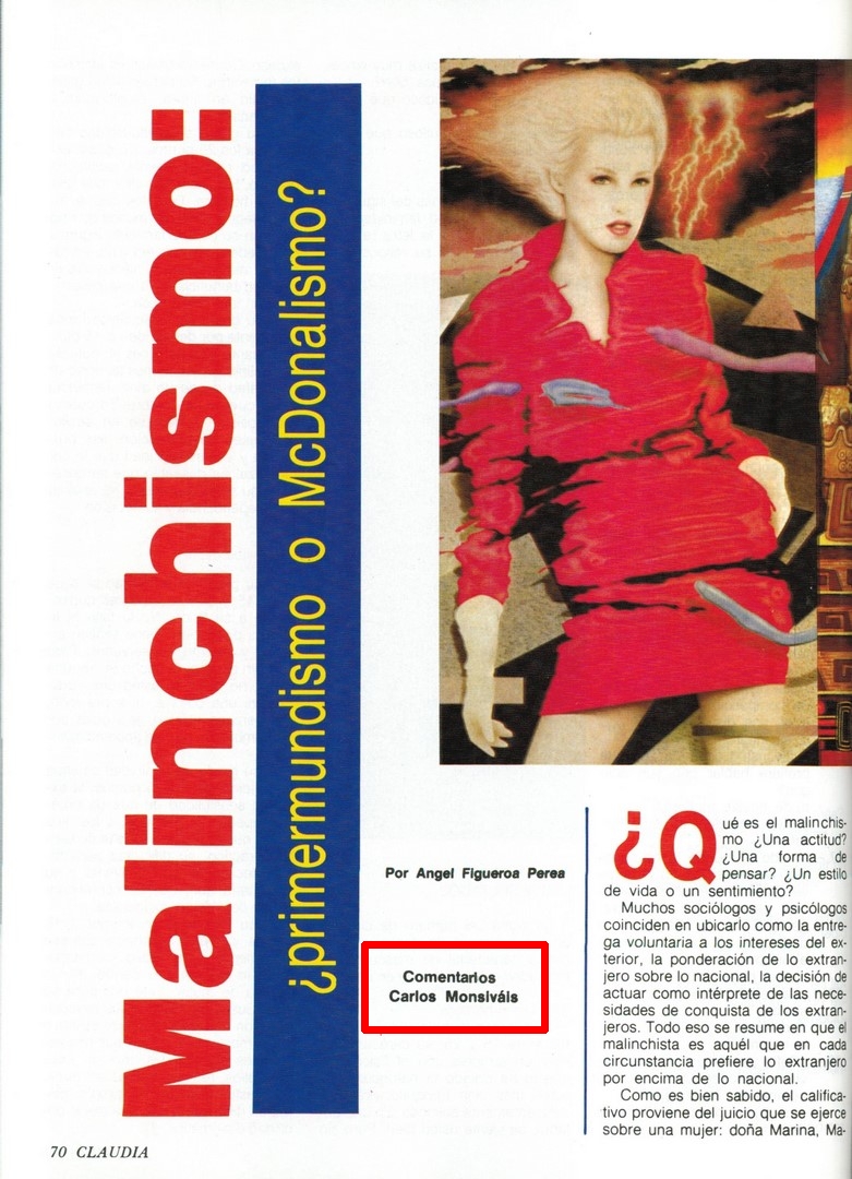 Malinchismo: ¿primermundismo o McDonalismo? Compartir Documento MX-SC-DGB-BP-MC-HA0078-A-1 Descargar Adjuntos MX-SC-DGB-BP-MC-HA0078-A MX-SC-DGB-BP-MC-HA0078-C Monsiteca artículosTítulo del artículoMalinchismo: ¿primermundismo o McDonalismo?Nombre de la revista Claudia Año de inicio 1965 Editorial Ene Periodicidad mensual Fecha de publicaciónSeptiembre 1992Nombre del autor o autora Angel Figueroa Perea Página de inicio70Número de revista324Contenido temáticoMonsiváis nos comenta "El malinchismo es ¿una actitud? ¿Una forma de pensar? ¿Un estilo de vida o un sentimiento?".ColecciónHemerográfico
