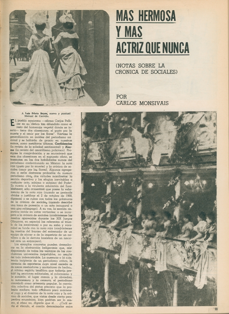 Mas hermosa y mas actriz que nunca (notas sobre la crónica de sociales) Compartir Documento MX-SC-DGB-BP-MC-HA1032-A Descargar Adjuntos MX-SC-DGB-BP-MC-HA1032-C Monsiteca artículosTítulo del artículoMas hermosa y mas actriz que nunca (notas sobre la crónica de sociales)Nombre de la revista La Cultura en México Año de inicio 1962 Editorial Revista Siempre Periodicidad semanal Fecha de publicación19 Febrero 1969Nombre del autor o autora Carlos Monsiváis Página de inicioIIINúmero de revista366Contenido temático ColecciónHemerográfico