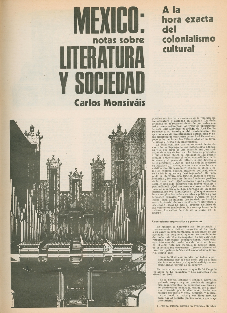 México: A la hora exacta del colonialismo cultural, notas sobre literatura y sociedad Compartir Documento MX-SC-DGB-BP-MC-HA1108-A Descargar Adjuntos MX-SC-DGB-BP-MC-HA1108-C Monsiteca artículosTítulo del artículoMéxico: A la hora exacta del colonialismo cultural, notas sobre literatura y sociedadNombre de la revista La Cultura en México Año de inicio 1962 Editorial Revista Siempre Periodicidad semanal Fecha de publicación17 Enero 1973Nombre del autor o autora Carlos Monsiváis Página de inicioIXNúmero de revista571Contenido temático ColecciónHemerográfico