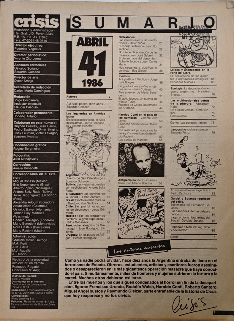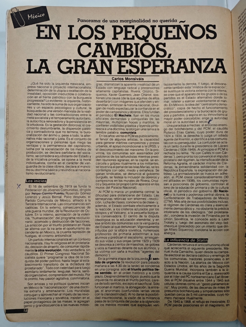 México: en los pequeños cambios, la gran esperanza Compartir Documento MX-SC-DGB-BP-MC-HA0904-A-1 Descargar Adjuntos MX-SC-DGB-BP-MC-HA0904-B MX-SC-DGB-BP-MC-HA0904-C Monsiteca artículosTítulo del artículoMéxico: en los pequeños cambios, la gran esperanzaNombre de la revista Crisis Año de inicio 1973 Editorial Del Noroeste Periodicidad mensual Fecha de publicación1986Nombre del autor o autora Carlos Monsiváis Página de inicio18Número de revista41Contenido temático