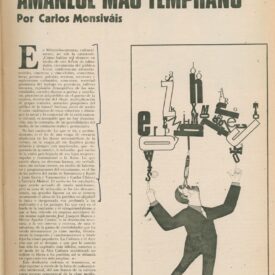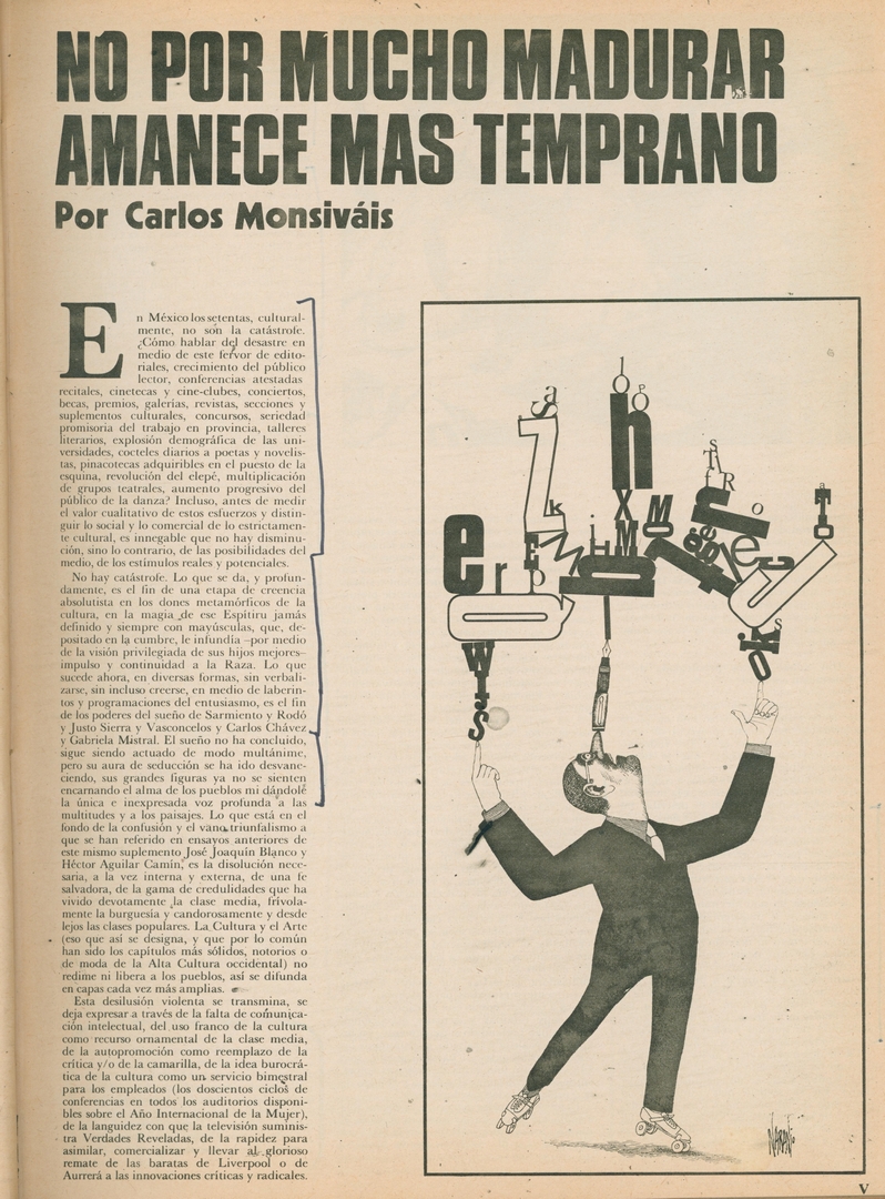 No por mucho madurar amanece más temprano Compartir Documento MX-SC-DGB-BP-MC-HA1151-A Descargar Adjuntos MX-SC-DGB-BP-MC-HA1151-C Monsiteca artículosTítulo del artículoNo por mucho madurar amanece más tempranoNombre de la revista La Cultura en México Año de inicio 1962 Editorial Revista Siempre Periodicidad semanal Fecha de publicación3 Septiembre 1975Nombre del autor o autora Carlos Monsiváis Página de inicioVNúmero de revista708Contenido temático ColecciónHemerográfico