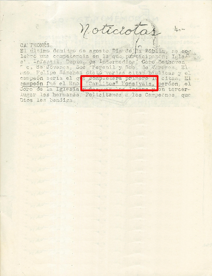 Noticias y Noticiotas Compartir Documento MX-SC-DGB-BP-MC-HA0866-A Descargar Adjuntos MX-SC-DGB-BP-MC-HA0866-A-1 MX-SC-DGB-BP-MC-HA0866-C Monsiteca artículosTítulo del artículoNoticias y NoticiotasNombre de la revista VOZ DEL INTERMEDIO Año de inicio 1954 Editorial S/E Periodicidad quincenal Fecha de publicación1954Nombre del autor o autora Guerito Pedraza Página de inicio4Número de revista18Contenido temáticoParticipación en un concurso sobre Citas bíblicas en el que “Carlitos Monsiváis” fue ganador del primer lugar.ColecciónHemerográfico