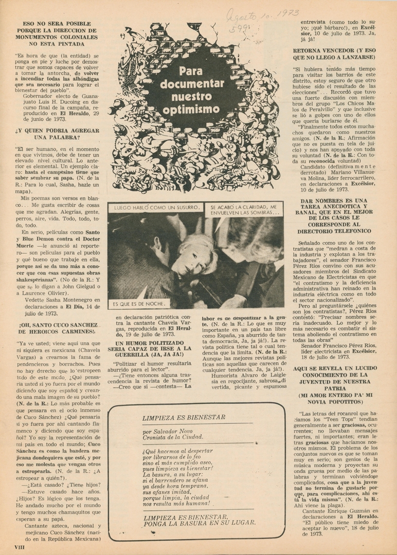 Para documentar nuestro optimismo: Eso no será posible porque la dirección de monumentos coloniales no esta pintada Compartir Documento MX-SC-DGB-BP-MC-HA1129-A Descargar Adjuntos MX-SC-DGB-BP-MC-HA1129-C Monsiteca artículosTítulo del artículoPara documentar nuestro optimismo: Eso no será posible porque la dirección de monumentos coloniales no esta pintadaNombre de la revista La Cultura en México Año de inicio 1962 Editorial Revista Siempre Periodicidad semanal Fecha de publicación1 Agosto 1973Nombre del autor o autora Carlos Monsiváis Página de inicioVIIINúmero de revista599Contenido temático ColecciónHemerográfico