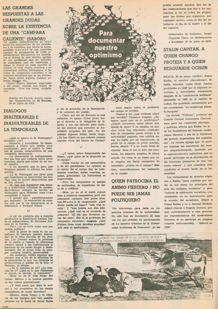 Para documentar nuestro optimismo: Las grandes respuestas a las grandes dudas sobre la existencia de una “campaña caliente” (sabor) Compartir Documento MX-SC-DGB-BP-MC-HA1128-A Descargar Adjuntos MX-SC-DGB-BP-MC-HA1128-C Monsiteca artículosTítulo del artículoPara documentar nuestro optimismo: Las grandes respuestas a las grandes dudas sobre la existencia de una "campaña caliente" (sabor)Nombre de la revista La Cultura en México Año de inicio 1962 Editorial Revista Siempre Periodicidad semanal Fecha de publicación11 Julio 1973Nombre del autor o autora Carlos Monsiváis Página de inicioVIIINúmero de revista596Contenido temático ColecciónHemerográfico