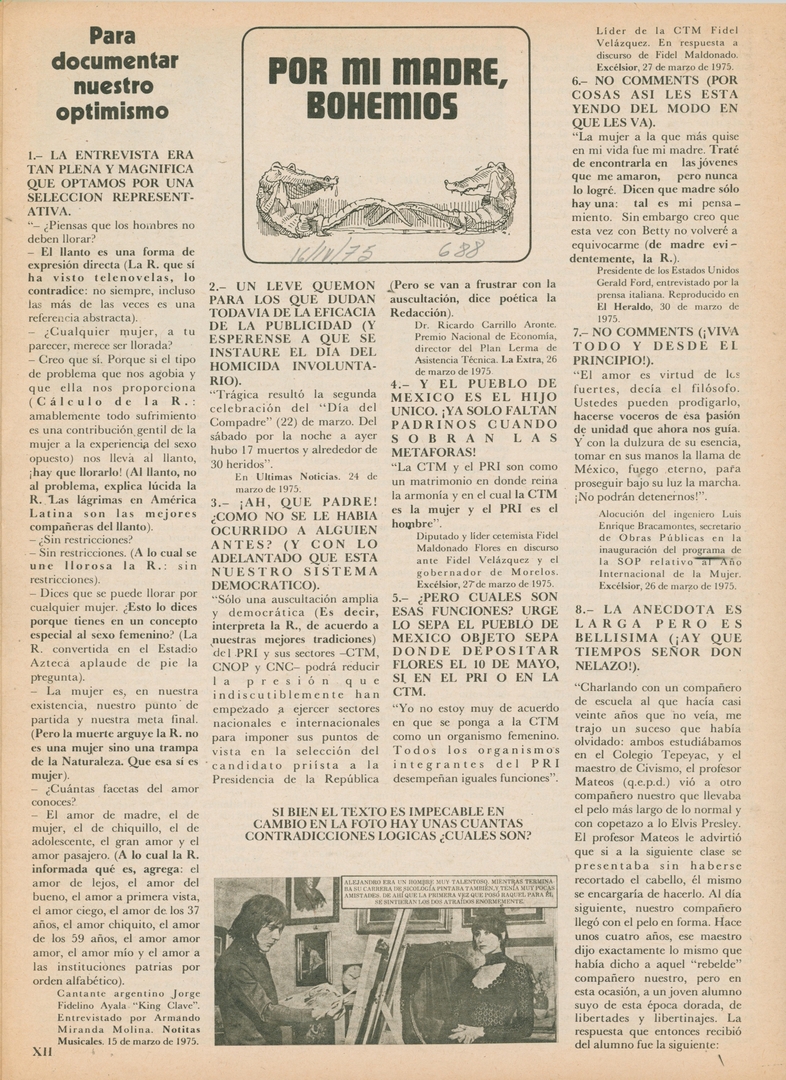 Por mi madre, bohemios. Para documentar nuestro optimismo: La entrevista era tan plena y magnifica que optamos por una selección representativa Compartir Documento MX-SC-DGB-BP-MC-HA1139-A Descargar Adjuntos MX-SC-DGB-BP-MC-HA1139-C Monsiteca artículosTítulo del artículoPor mi madre, bohemios. Para documentar nuestro optimismo: La entrevista era tan plena y magnifica que optamos por una selección representativaNombre de la revista La Cultura en México Año de inicio 1962 Editorial Revista Siempre Periodicidad semanal Fecha de publicación16 Abril 1975Nombre del autor o autora Carlos Monsiváis Página de inicioXIINúmero de revista688Contenido temático ColecciónHemerográfico