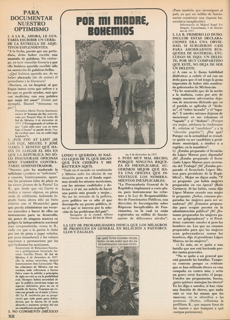 Por mi madre, bohemios. Para documentar nuestro optimismo: A la R., ahora, le gustaría escribir un cerro de la estrella de adjetivos esplendentes Compartir Documento MX-SC-DGB-BP-MC-HA1260-A Descargar Adjuntos MX-SC-DGB-BP-MC-HA1260-C Monsiteca artículosTítulo del artículoPor mi madre, bohemios. Para documentar nuestro optimismo: A la R., ahora, le gustaría escribir un cerro de la estrella de adjetivos esplendentesNombre de la revista La Cultura en México Año de inicio 1962 Editorial Revista Siempre Periodicidad semanal Fecha de publicación29 Diciembre 1977Nombre del autor o autora Carlos Monsiváis Página de inicioXIINúmero de revista827Contenido temático ColecciónHemerográfico