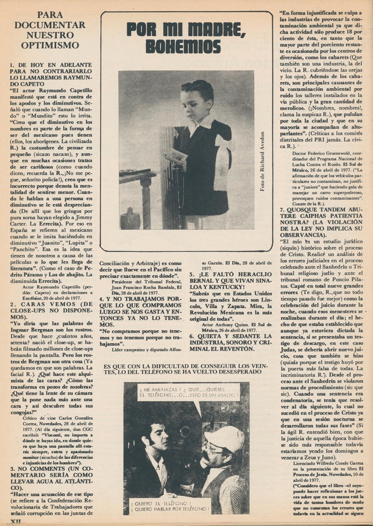 Por mi madre, bohemios. Para documentar nuestro optimismo: De hoy en adelante para no contrariarlo lo llamaremos Raymundo Capeto Compartir Documento MX-SC-DGB-BP-MC-HA1226-A Descargar Adjuntos MX-SC-DGB-BP-MC-HA1226-C Monsiteca artículosTítulo del artículoPor mi madre, bohemios. Para documentar nuestro optimismo: De hoy en adelante para no contrariarlo lo llamaremos Raymundo CapetoNombre de la revista La Cultura en México Año de inicio 1962 Editorial Revista Siempre Periodicidad semanal Fecha de publicación27 Mayo 1977Nombre del autor o autora Carlos Monsiváis Página de inicioXIINúmero de revista796Contenido temático ColecciónHemerográfico
