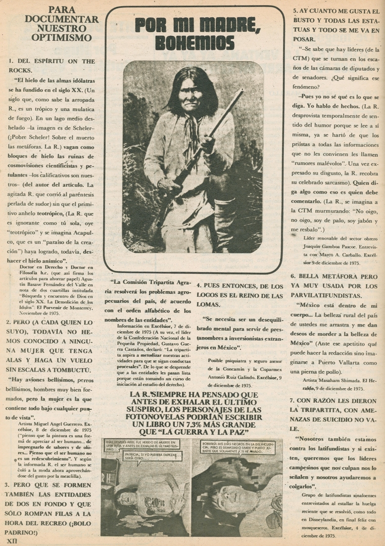 Por mi madre, bohemios. Para documentar nuestro optimismo: Del espiritu on the rocks Compartir Documento MX-SC-DGB-BP-MC-HA1168-A Descargar Adjuntos MX-SC-DGB-BP-MC-HA1168-C Monsiteca artículosTítulo del artículoPor mi madre, bohemios. Para documentar nuestro optimismo: Del espiritu on the rocksNombre de la revista La Cultura en México Año de inicio 1962 Editorial Revista Siempre Periodicidad semanal Fecha de publicación23 Diciembre 1975Nombre del autor o autora Carlos Monsiváis Página de inicioXIINúmero de revista724Contenido temático ColecciónHemerográfico