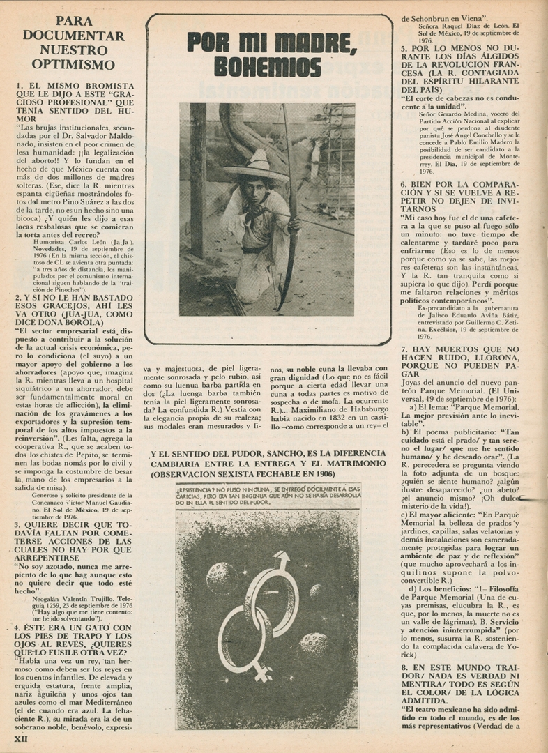 Por mi madre, bohemios. Para documentar nuestro optimismo: El mismo bromista que le dijo a este “gracioso profesional” que tenía sentido del humor Compartir Documento MX-SC-DGB-BP-MC-HA1197-A Descargar Adjuntos MX-SC-DGB-BP-MC-HA1197-C Monsiteca artículosTítulo del artículoPor mi madre, bohemios. Para documentar nuestro optimismo: El mismo bromista que le dijo a este "gracioso profesional" que tenía sentido del humorNombre de la revista La Cultura en México Año de inicio 1962 Editorial Revista Siempre Periodicidad semanal Fecha de publicación19 Octubre1976Nombre del autor o autora Carlos Monsiváis Página de inicioXIINúmero de revista766Contenido temático ColecciónHemerográfico