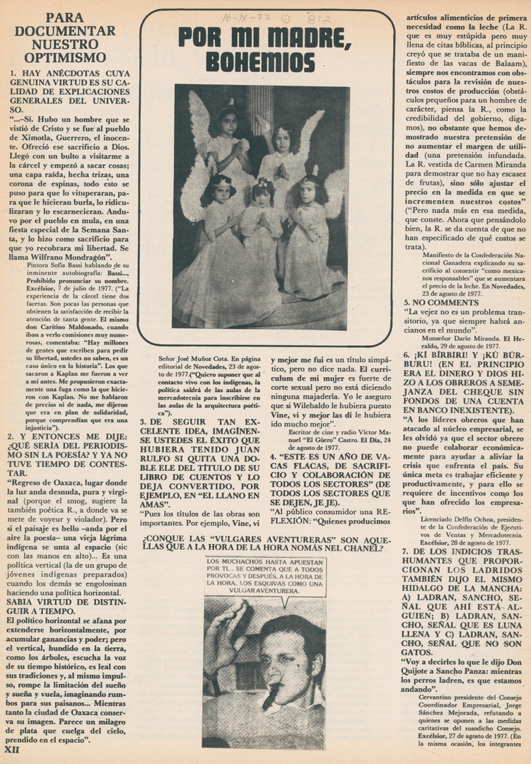 Por mi madre, bohemios. Para documentar nuestro optimismo: Hay anécdotas cuya genuina virtud es su calidad de explicaciones generales del universo Compartir Documento MX-SC-DGB-BP-MC-HA1243-A Descargar Adjuntos MX-SC-DGB-BP-MC-HA1243-C Monsiteca artículosTítulo del artículoPor mi madre, bohemios. Para documentar nuestro optimismo: Hay anécdotas cuya genuina virtud es su calidad de explicaciones generales del universoNombre de la revista La Cultura en México Año de inicio 1962 Editorial Revista Siempre Periodicidad semanal Fecha de publicación16 Septiembre 1977Nombre del autor o autora Carlos Monsiváis Página de inicioXIINúmero de revista812Contenido temático ColecciónHemerográfico