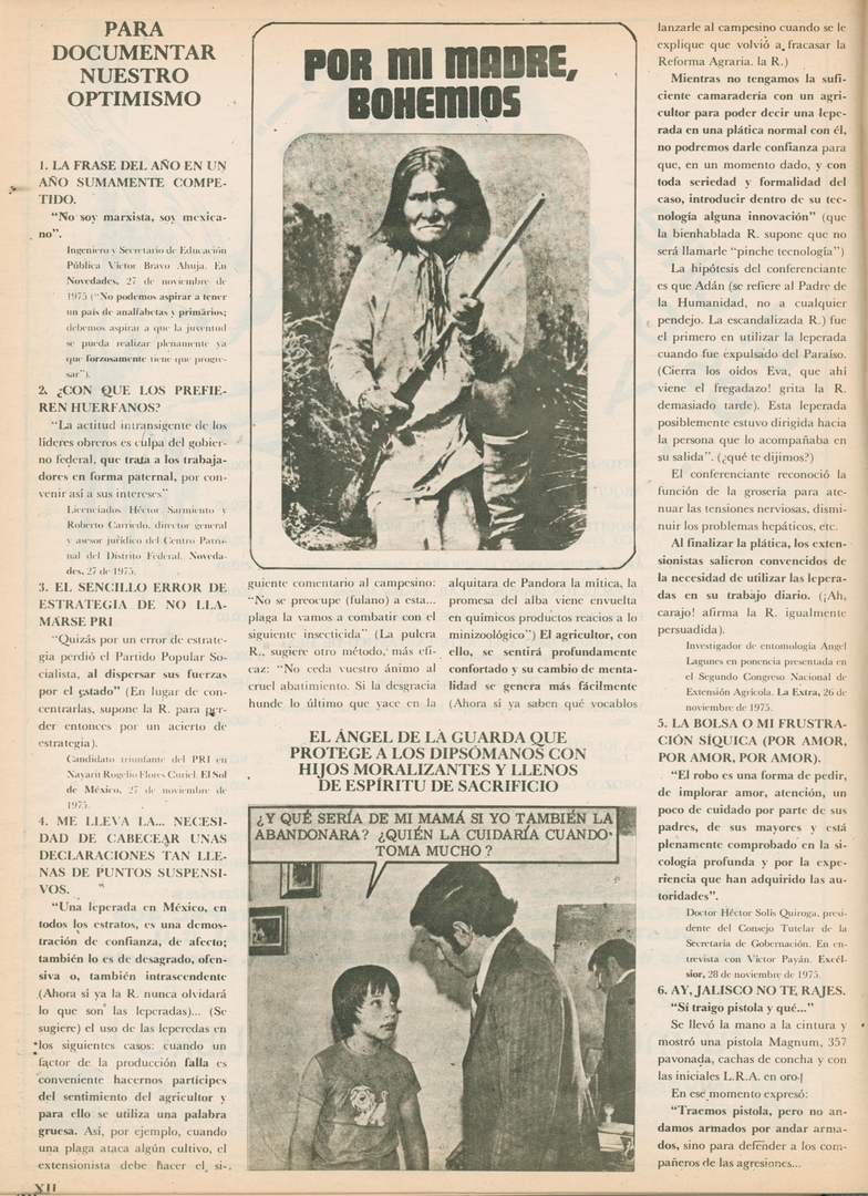 Por mi madre, bohemios. Para documentar nuestro optimismo: La frase del año en una año sumamente competido Compartir Documento MX-SC-DGB-BP-MC-HA1167-A Descargar Adjuntos MX-SC-DGB-BP-MC-HA1167-C Monsiteca artículosTítulo del artículoPor mi madre, bohemios. Para documentar nuestro optimismo: La frase del año en una año sumamente competidoNombre de la revista La Cultura en México Año de inicio 1962 Editorial Revista Siempre Periodicidad semanal Fecha de publicación16 Diciembre 1975Nombre del autor o autora Carlos Monsiváis Página de inicioXIINúmero de revista723Contenido temático ColecciónHemerográfico