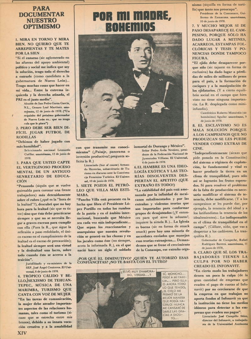Por mi madre, bohemios. Para documentar nuestro optimismo: Mira en torno y mira bien, no quiero que te arrepientas y te mates por la sien Compartir Documento MX-SC-DGB-BP-MC-HA1283-A Descargar Adjuntos MX-SC-DGB-BP-MC-HA1283-C Monsiteca artículosTítulo del artículoPor mi madre, bohemios. Para documentar nuestro optimismo: Mira en torno y mira bien, no quiero que te arrepientas y te mates por la sienNombre de la revista La Cultura en México Año de inicio 1962 Editorial Revista Siempre Periodicidad semanal Fecha de publicación5 Julio 1978Nombre del autor o autora Carlos Monsiváis Página de inicioXIVNúmero de revista854Contenido temático ColecciónHemerográfico