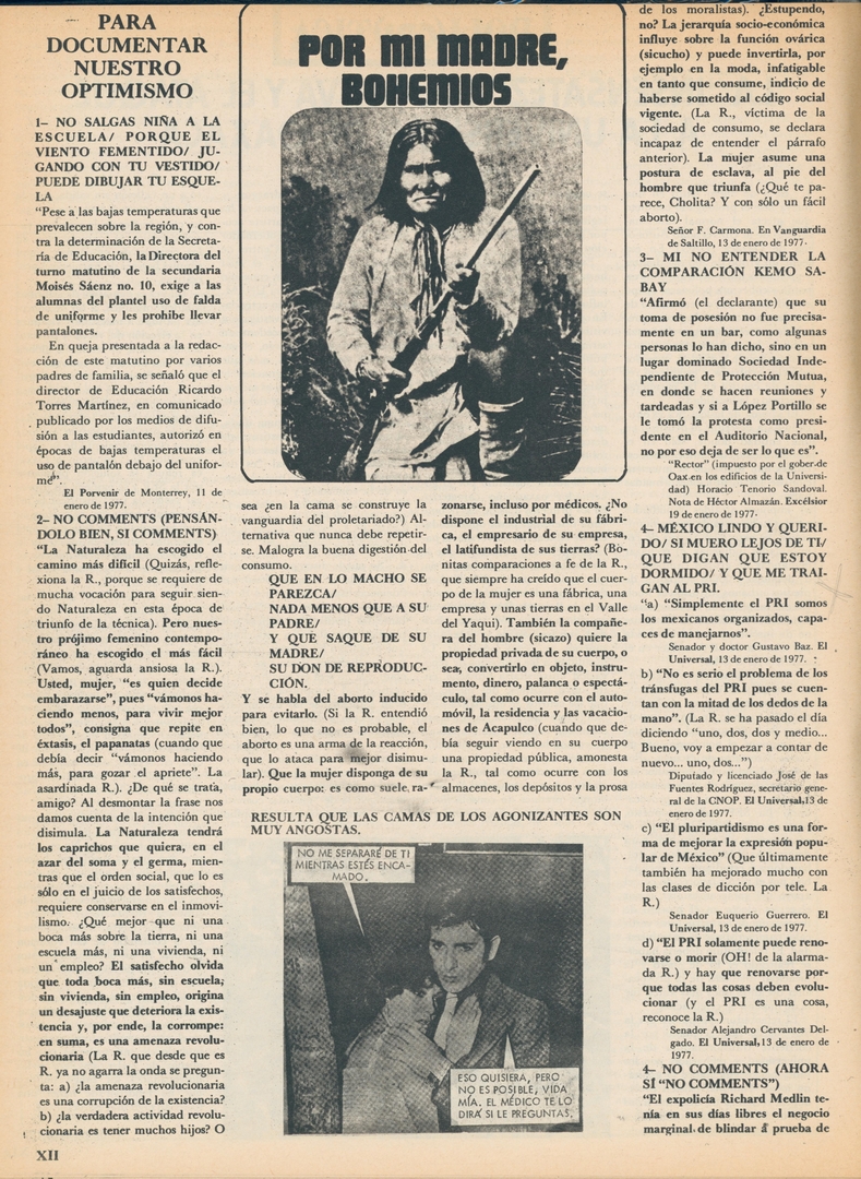 Por mi madre, bohemios. Para documentar nuestro optimismo: No salgas niña a la escuela/ porque el viento fementido/ jugando con tu vestido/ puede dibujar tu esquela