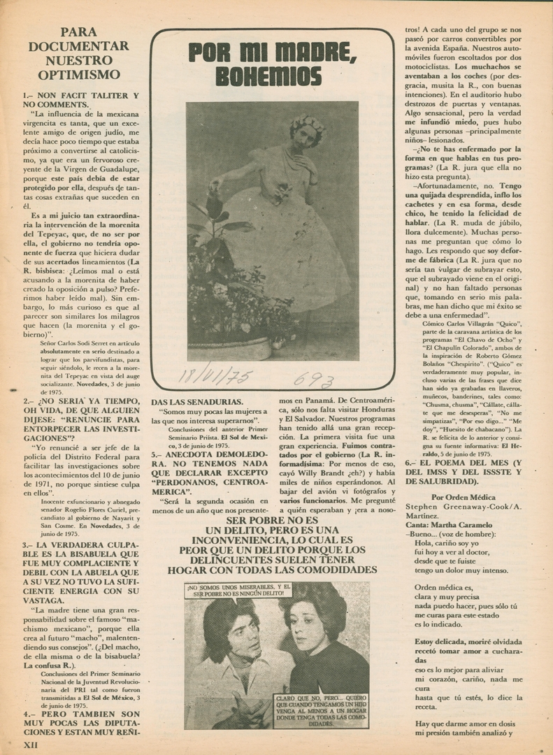 Por mi madre, bohemios. Para documentar nuestro optimismo: Non facit taliter y no comments Compartir Documento MX-SC-DGB-BP-MC-HA1142-A Descargar Adjuntos MX-SC-DGB-BP-MC-HA1142-C Monsiteca artículosTítulo del artículoPor mi madre, bohemios. Para documentar nuestro optimismo: Non facit taliter y no commentsNombre de la revista La Cultura en México Año de inicio 1962 Editorial Revista Siempre Periodicidad semanal Fecha de publicación18 Junio 1975Nombre del autor o autora Carlos Monsiváis Página de inicioXIINúmero de revista693Contenido temático ColecciónHemerográfico