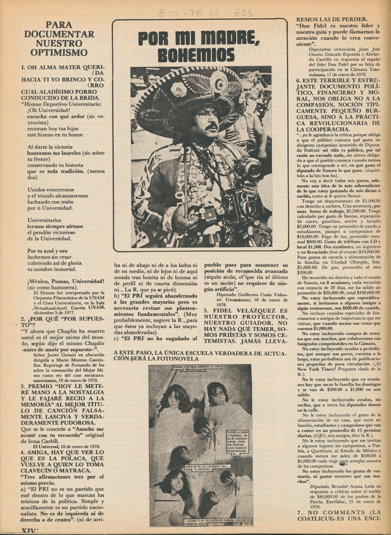Por mi madre, bohemios. Para documentar nuestro optimismo: Oh alma mater querida hacia ti yo brinco y corro cual aladísimo porro conducido de la brida