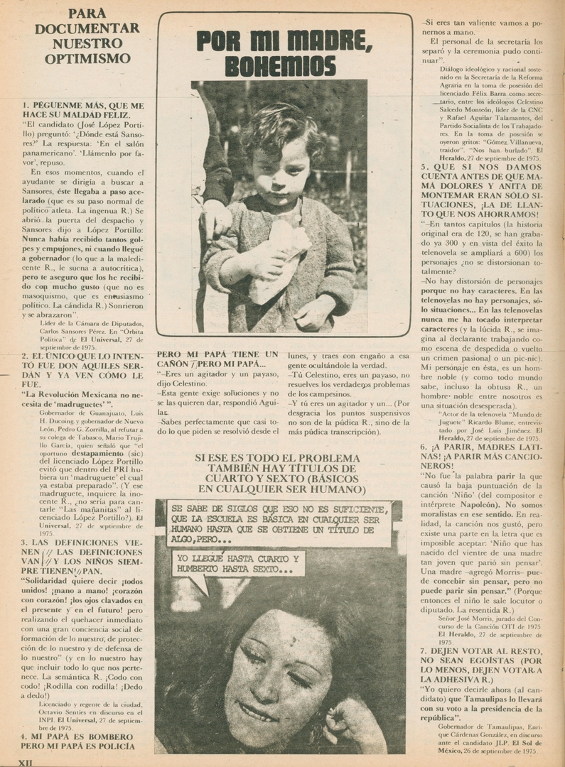 Por mi madre, bohemios. Para documentar nuestro optimismo: Péguenme más, que me hace su maldad feliz Compartir Documento MX-SC-DGB-BP-MC-HA1159-A Descargar Adjuntos MX-SC-DGB-BP-MC-HA1159-C Monsiteca artículosTítulo del artículoPor mi madre, bohemios. Para documentar nuestro optimismo: Péguenme más, que me hace su maldad felizNombre de la revista La Cultura en México Año de inicio 1962 Editorial Revista Siempre Periodicidad semanal Fecha de publicación15 Octubre 1975Nombre del autor o autora Carlos Monsiváis Página de inicioXIINúmero de revista714Contenido temático ColecciónHemerográfico