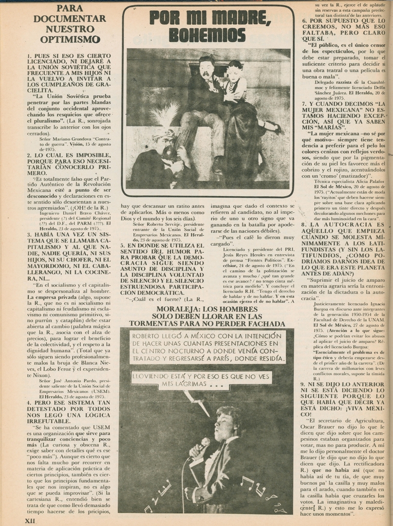 Por mi madre, bohemios. Para documentar nuestro optimismo: Pues si eso es cierto licenciado, ni dejaré a la Unión Soviética que frecuente a mis hijos ni la vuelvo a invitar a los cumpleaños de Gracielita