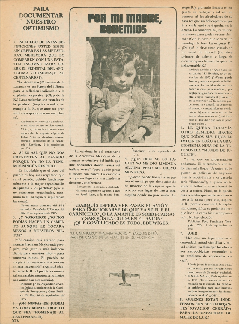 Por mi madre, bohemios. Para documentar nuestro optimismo: Si luego de estas definiciones usted sigue sin creer en las metáforas, merecerá que lo comparen con una estatua insomne izada sobre el pedestal del apotegma (homenaje al centenario)
