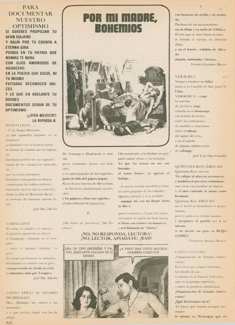 Por mi madre, bohemios. Para documentar nuestro optimismo: Si quieres propiciar tu afán viajero y salir por tu cuenta a eterna gira piensa en tu patria que nomas te mira con ojos amorosos de aguacero