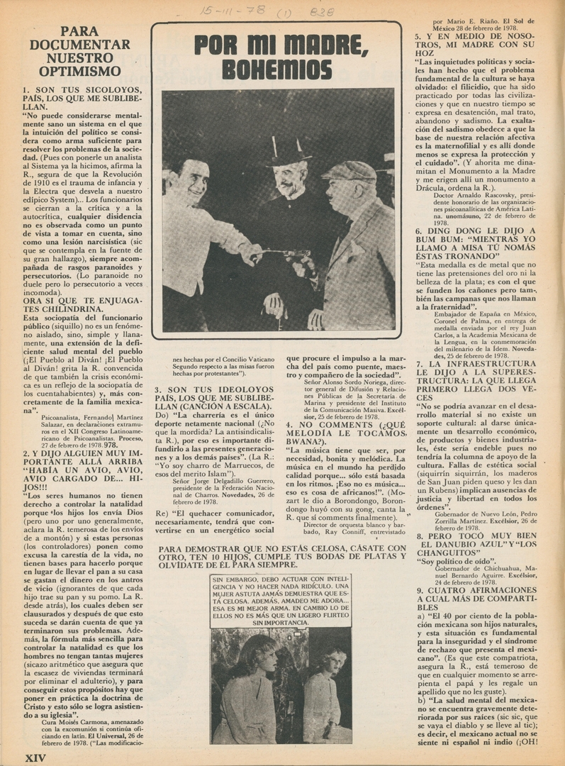 Por mi madre, bohemios. Para documentar nuestro optimismo: Son tus sicoloyos, país los que me sublibellan Compartir Documento MX-SC-DGB-BP-MC-HA1270-A Descargar Adjuntos MX-SC-DGB-BP-MC-HA1270-C Monsiteca artículosTítulo del artículoPor mi madre, bohemios. Para documentar nuestro optimismo: Son tus sicoloyos, país los que me sublibellanNombre de la revista La Cultura en México Año de inicio 1962 Editorial Revista Siempre Periodicidad semanal Fecha de publicación15 Marzo 1978Nombre del autor o autora Carlos Monsiváis Página de inicioXIVNúmero de revista838Contenido temático ColecciónHemerográfico