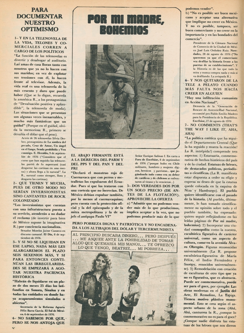 Por mi madre, bohemios. Para documentar nuestro optimismo: Y en la telenovela de la vida, telones y comerciales corren a cargo de los políticos Compartir Documento MX-SC-DGB-BP-MC-HA1196-A Descargar Adjuntos MX-SC-DGB-BP-MC-HA1196-C Monsiteca artículosTítulo del artículoPor mi madre, bohemios. Para documentar nuestro optimismo: Y en la telenovela de la vida, telones y comerciales corren a cargo de los políticosNombre de la revista La Cultura en México Año de inicio 1962 Editorial Revista Siempre Periodicidad semanal Fecha de publicación12 Octubre 1976Nombre del autor o autora Carlos Monsiváis Página de inicioXNúmero de revista765Contenido temático ColecciónHemerográfico