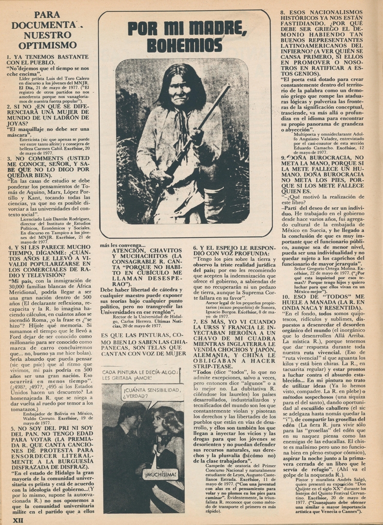 Por mi madre, bohemios. Para documentar nuestro optimismo: Ya tenemos bastante con el pueblo Compartir Documento MX-SC-DGB-BP-MC-HA1229-A Descargar Adjuntos MX-SC-DGB-BP-MC-HA1229-C Monsiteca artículosTítulo del artículoPor mi madre, bohemios. Para documentar nuestro optimismo: Ya tenemos bastante con el puebloNombre de la revista La Cultura en México Año de inicio 1962 Editorial Revista Siempre Periodicidad semanal Fecha de publicación17 Junio 1977Nombre del autor o autora Carlos Monsiváis Página de inicioXIINúmero de revista799Contenido temático ColecciónHemerográfico