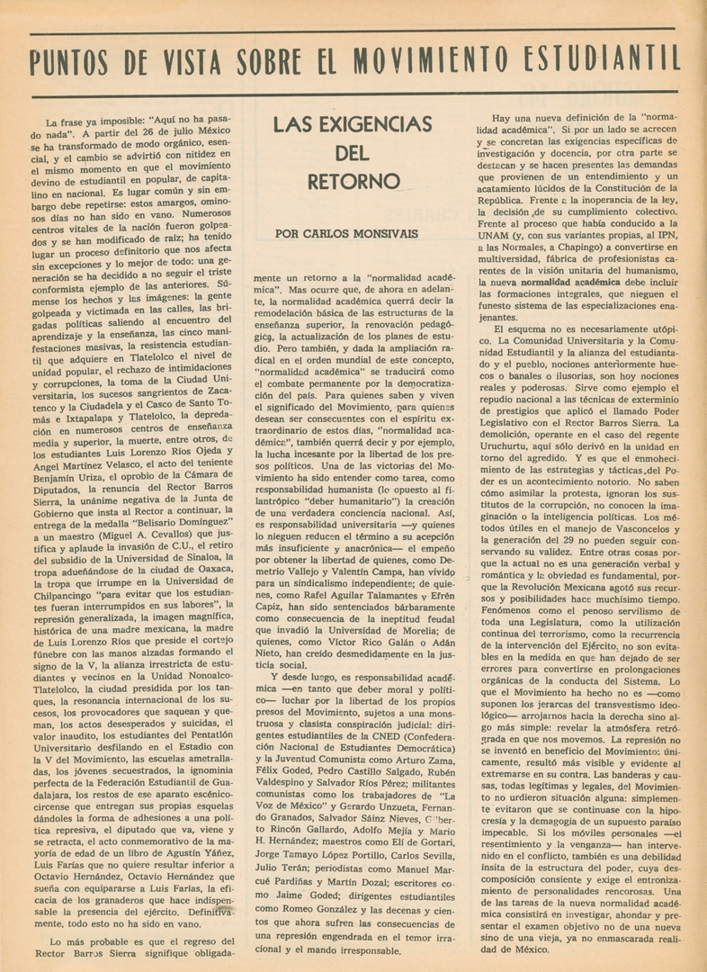 Puntos de vista sobre el movimiento estudiantil. Las exigencias del retorno Compartir Documento MX-SC-DGB-BP-MC-HA1027-A Descargar Adjuntos MX-SC-DGB-BP-MC-HA1027-C Monsiteca artículosTítulo del artículoPuntos de vista sobre el movimiento estudiantil. Las exigencias del retornoNombre de la revista La Cultura en México Año de inicio 1962 Editorial Revista Siempre Periodicidad semanal Fecha de publicación09 Octubre 1968Nombre del autor o autora Carlos Monsiváis Página de inicio Número de revista347Contenido temático ColecciónHemerográfico