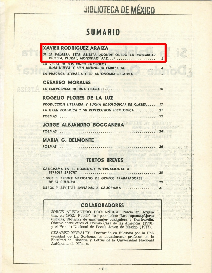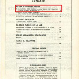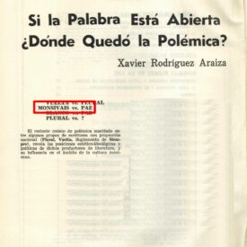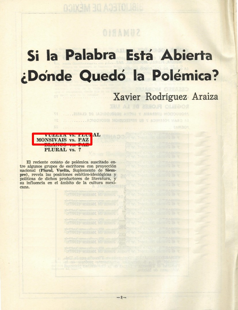 El reciente conato de polémica suscitado entre algunos grupos de escritores con proyección nacional (Plural; Vuelta, Suplemento de Siempre), revela las posiciones estético-ideológicas y políticas de dichos productores de literatura, y su influencia en el ámbito de la cultura mexicana. La polémica--pobre en cuánto a fundamentación teórica--, es síntoma de la "crisis" estructural y superestructural (aquí interesa la producción literaria y la política cultural del estado) del sistema capitalista. Decimos conato porque el centro de la discusión en torno a la función social del escritor, su relación con el Estado, a la izquierda y la derecha en México, etc., estuvo pródiga en "aclaraciones y olvidos", en "argumentaciones sobre política", en defensa y ataque a la "abstracta izquierda", en insultos, etc., capitalizados por Octavio Paz y Carlos Monsiváis en las páginas de la liberal tribuna de la revista Proceso. El conato de polémica por lo menos es revelador de las posiciones literarias e intelectuales que se debaten sordamente en el raquítico espacio de la ideología artística nacional, son posiciones teóricas en torno a la literatura, la práctica del escritor y su posición de clase. La contradicción principal entre estos grupos que poseen fuerte respaldo económico y amplia difusión pudo darse entre los que elaboran las revistas Vuelta y Plural, sólo que Vuelta se dio la vuelta abandonando el campo de batalla y de paso a su más serio retador. Estas son palabras de Plural: "queremos plantear confrontación de ideas. Esperamos que por parte de Vuelta se formule siquiera alguna, aunque esto les cueste trabajo. Descartamos de antemano cualquier intercambio logo frénico de insultos". Esta demanda condicionada no se dejó leer entre los ataques de Paz y Monsiváis.