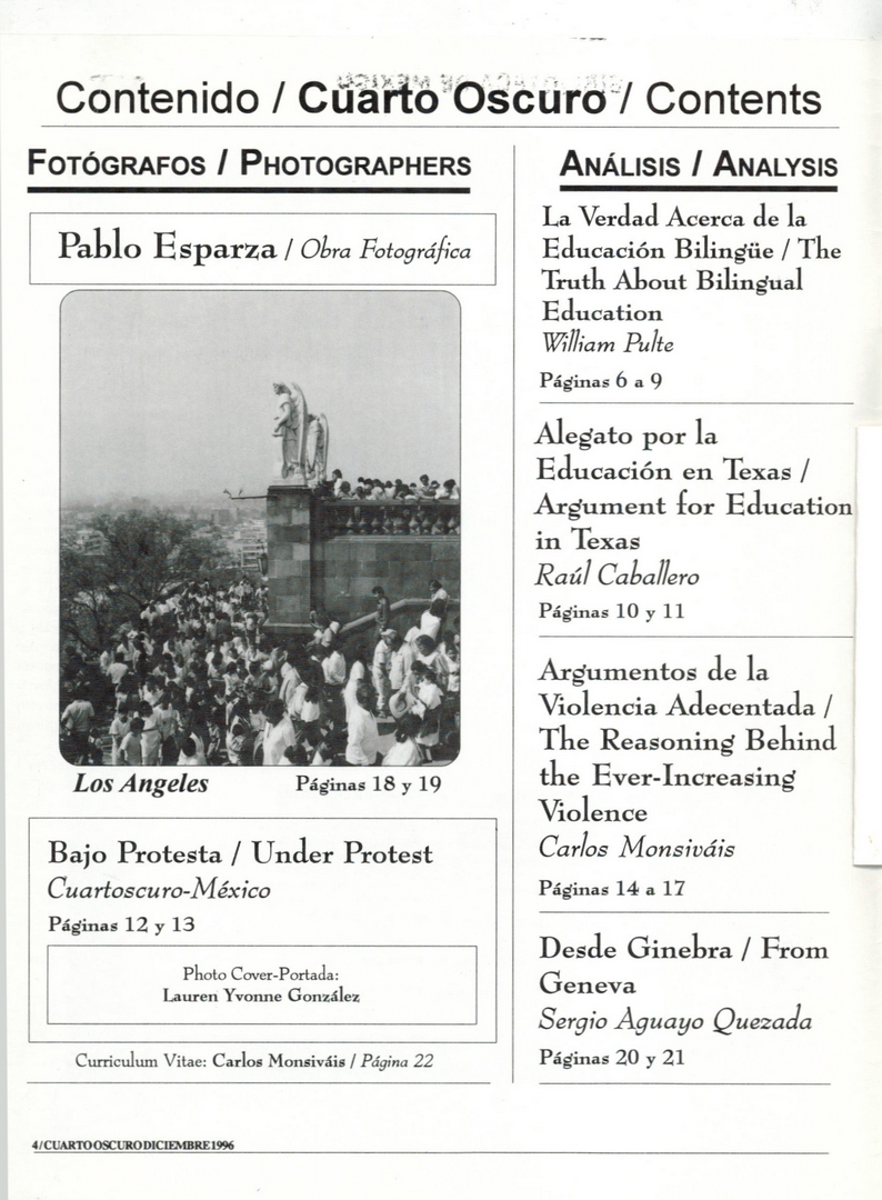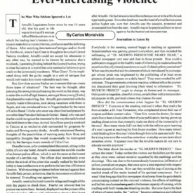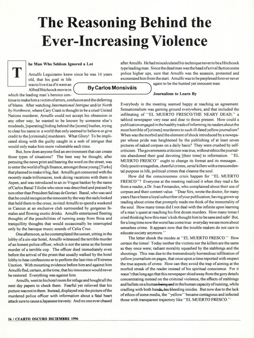 The reasoning behind the ever-increasing violence Compartir Documento MX-SC-DGB-BP-MC-HA0955-A Descargar Adjuntos MX-SC-DGB-BP-MC-HA0955-B MX-SC-DGB-BP-MC-HA0955-C Monsiteca artículosTítulo del artículoThe reasoning behind the ever-increasing violenceNombre de la revista Cuarto oscuro (monthly bilingual magazine; revista de fotógrafos y análisis) Año de inicio 1996 Editorial Cuarto Oscuro Periodicidad mensual Fecha de publicaciónDiciembre - 1996Nombre del autor o autora Carlos Monsiváis Página de inicio16Número de revista4Contenido temático ColecciónHemerográfico