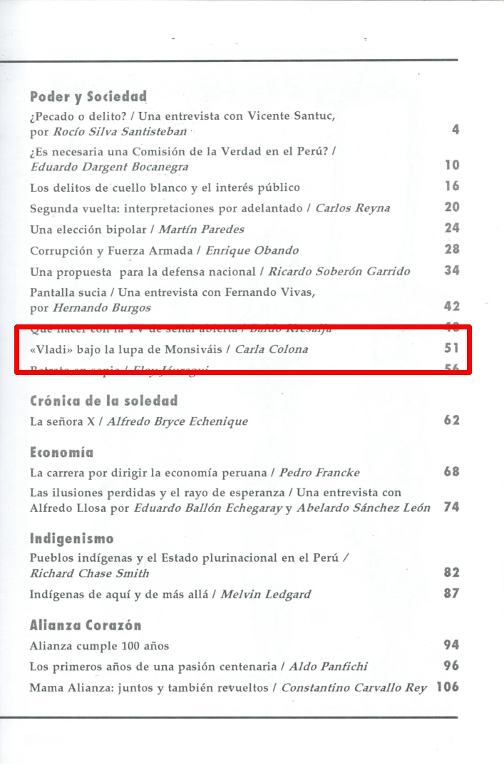 «Vladi» bajo la lupa de Monsiváis Compartir Documento MX-SC-DGB-BP-MC-HA0609-A Descargar Adjuntos MX-SC-DGB-BP-MC-HA0609-A-1 MX-SC-DGB-BP-MC-HA0609-B Monsiteca artículosTítulo del artículo«Vladi» bajo la lupa de MonsiváisNombre de la revista Quehacer Año de inicio 1996 Editorial DESCO Fondo Editorial Periodicidad bimestral Fecha de publicación2001Nombre del autor o autora Carla Colona Página de inicio51Número de revista129Contenido temáticoSi alguien duda de que existe una cultura latinoamericana, que oiga a sus políticos porque todos hablan igual con las diferencias que introducen las palabras vernáculasColecciónHemerográfico